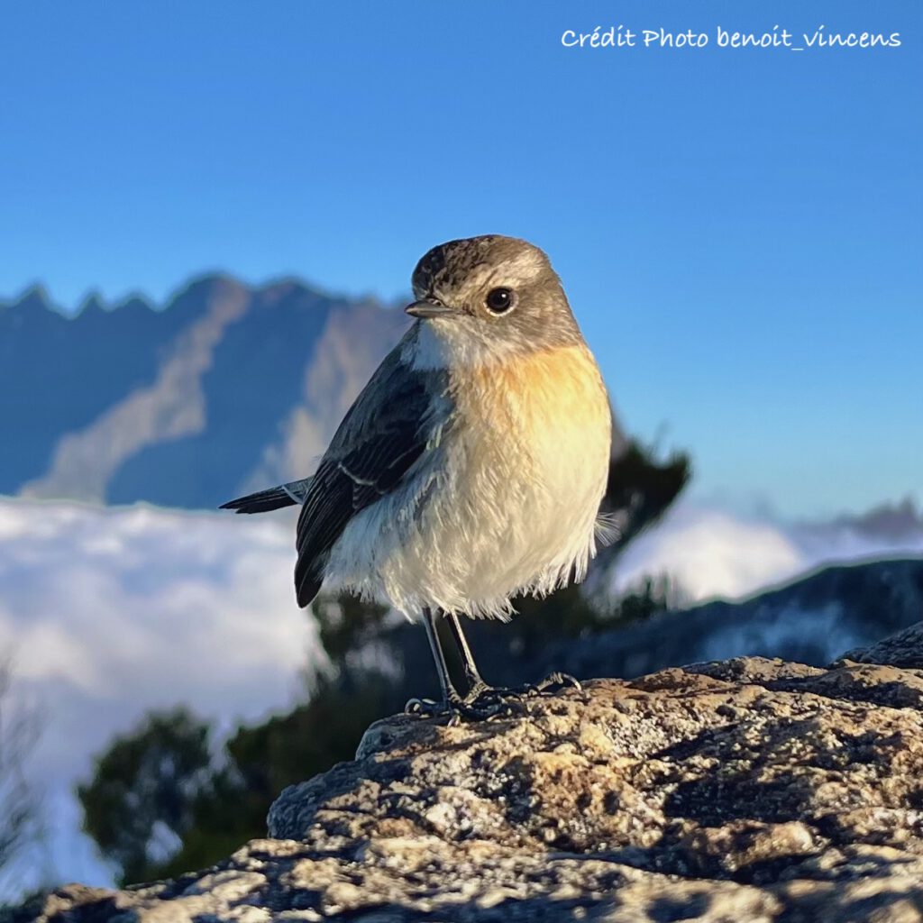 La Réunion héberge de nombreux petits passereaux, souvent endémiques, dont un s’appelle le « Tec-Tec ». Au Hazard de vous rencontrer il vous suivra quelques instants, voire un bon moment, pour voir si vous avez quelque chose d’intéressant. Ne lui donnez rien !!! Cela perturbe son alimentation et son évolution naturelle. Il doit apprendre a se nourrir par lui même. Certains se laissent approcher, habitués à croiser des humains : celui-ci a été photographié à moins de 50cm, au sommet de la Roche Ecrite !