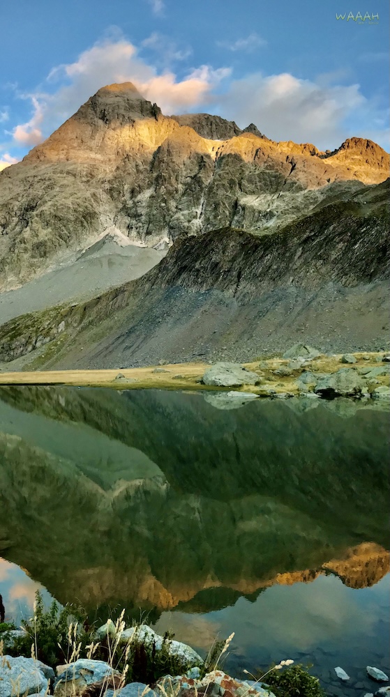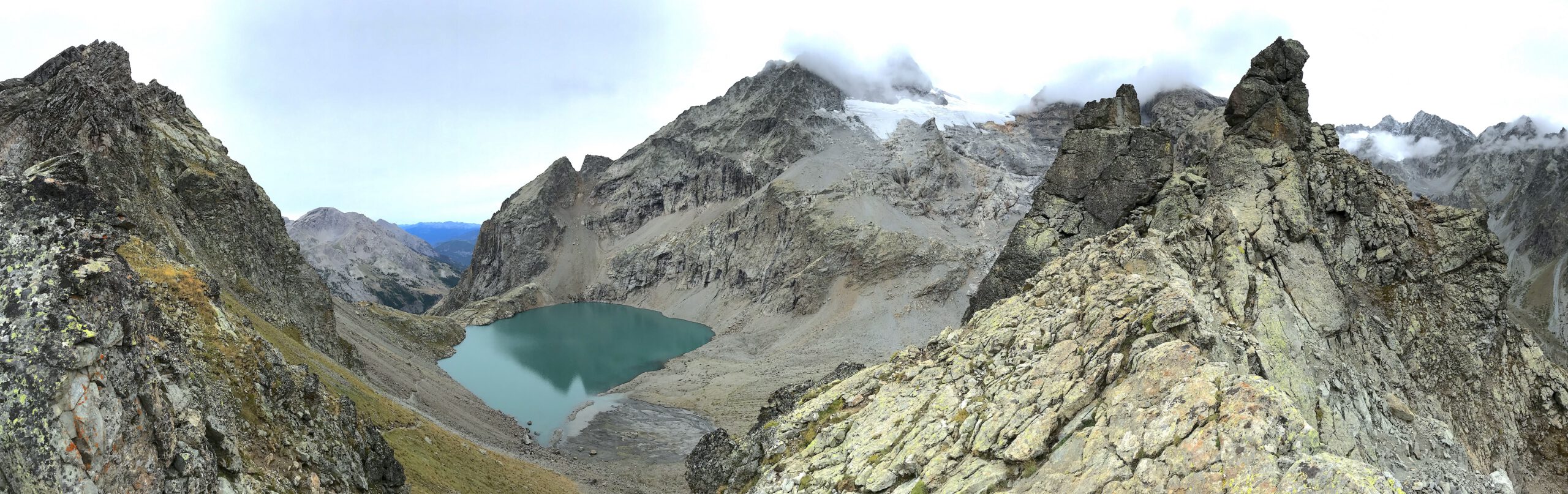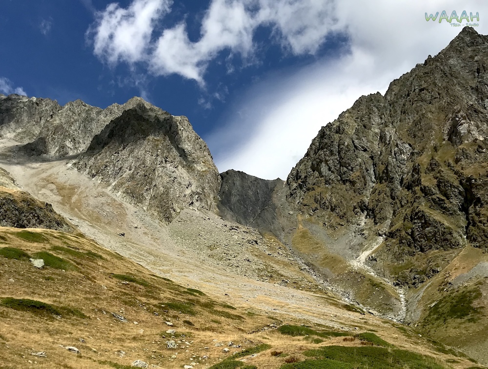Celle là vous ne l’oublierez pas ! Je sais que je me répète, mais c’est aussi ça la magie du GR54. Nous nous levons de bonne heure ce matin là – même si quitter Claire et Gil sera difficile – pour une ascension hors du commun. Si vous n’avez pas fait le GR20, vous aurez un aperçu de ce que ça peut représenter au cours de cette ascension. Effet Waaah Garanti au sommet du Col des Grangettes, avec vue sur le Lac de l’Eychauda et le glacier de Séguret Foran. Encore une belle journée pour admirer la faune et la flore au cours de cette magnifique étape.