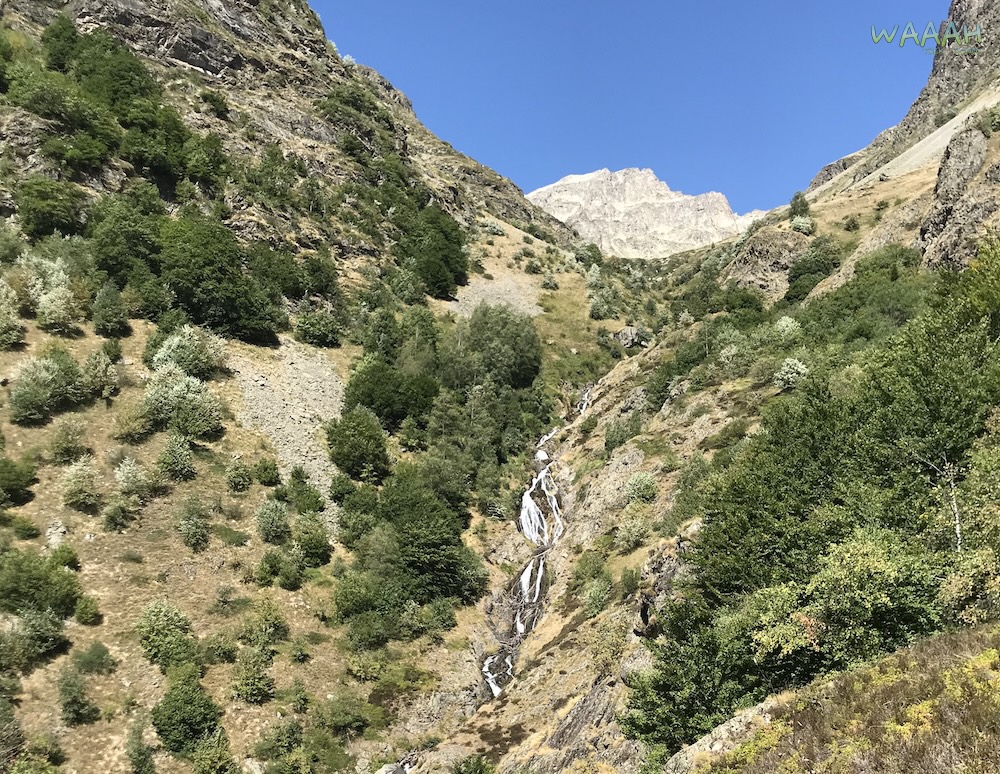 Après une petite réunion de vérification du matériel, nous entamons la montée vers le cirque de Côte Belle, sous le Pic de l’OLAN. Nous côtoyons au gré des lacets le torrent du Clot et la cascade de Combefroide. C’est déjà l’occasion de lever la tête pour observer si des vautours nous surplombent. C’est une étape qui nous permet de vite prendre de l’altitude et de voir notre point de départ s’éloigner, puis disparaitre… pour 12 jours !