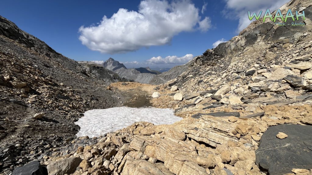 Cette étape, je l’attends avec impatience ! Nous quitterons la plaine de Chanrouge, surplombée par les magnifiques aiguilles de Chanrossa et des Corneillets, pour déboucher sur un hors sentier digne d’une autre planète ! Ambiance presque Martienne pour un effet WAAAH Garanti. Nous y découvrirons que certaines espèces de fleurs de montagne parviennent à y survivre, créant un contraste végétal/minéral assez surprenant. Un peu plus loin, ce sont des rochers blancs, ressemblant à s’y méprendre à des célèbres « chocolats blancs coco ronds », qui vous surprendront. Mais attention, n’essayez pas de les croquer ! Nous finirons ce second effet Kisscool, par le franchissement d’un col où 4 couleurs de roche se battent pour devenir le support de votre point de vue sur le Glacier de Gebroulaz et du lac Blanc.